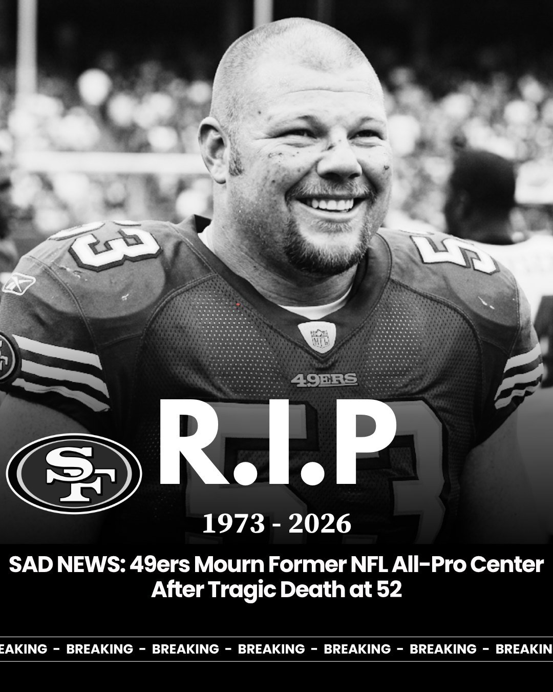 San Francisco, CA – The San Francisco 49ers community joins the NFL world in mourning the passing of a former All-Pro center at the age of 52, a player whose story continues to echo far beyond the field.