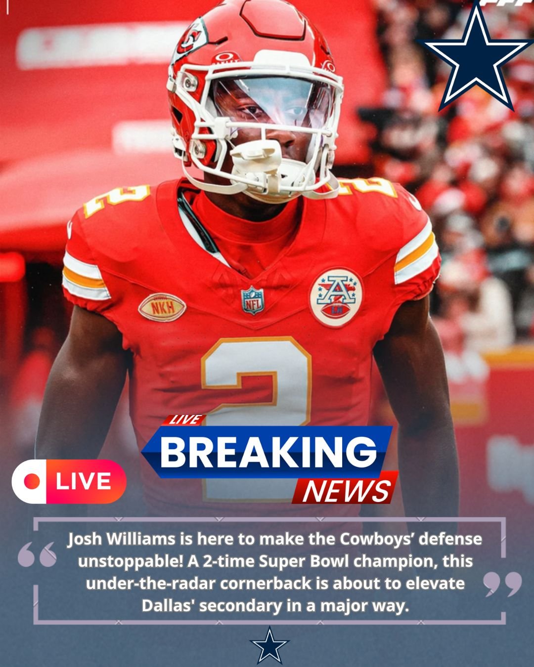 Bleacher Report’s Brad Gagnon predicts 2-time Super Bowl champion cornerback Josh Williams could leave the Kansas City Chiefs for a 1-year, $1.5 million free agent contract with the Cowboys, calling Williams the “Top Value” free agent at his position in this cycle.