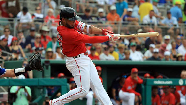 Feb 22, 2026; Fort Myers, Florida, USA; BBoston Red Sox first baseman Willson Contreras (40) singles during the third inning against the Toronto Blue Jays at JetBlue Park at Fenway South. Mandatory Credit: Kim Klement Neitzel-Imagn Images | Kim Klement Neitzel-Imagn Images© Kim Klement Neitzel-Imagn Images